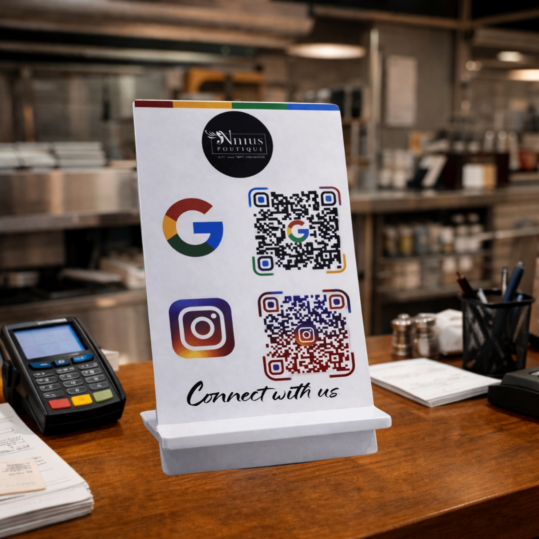 With two QR codes and NFC support, customers can connect with your business in seconds. Ideal for boosting reviews, followers, and online visibility—just tap or scan!