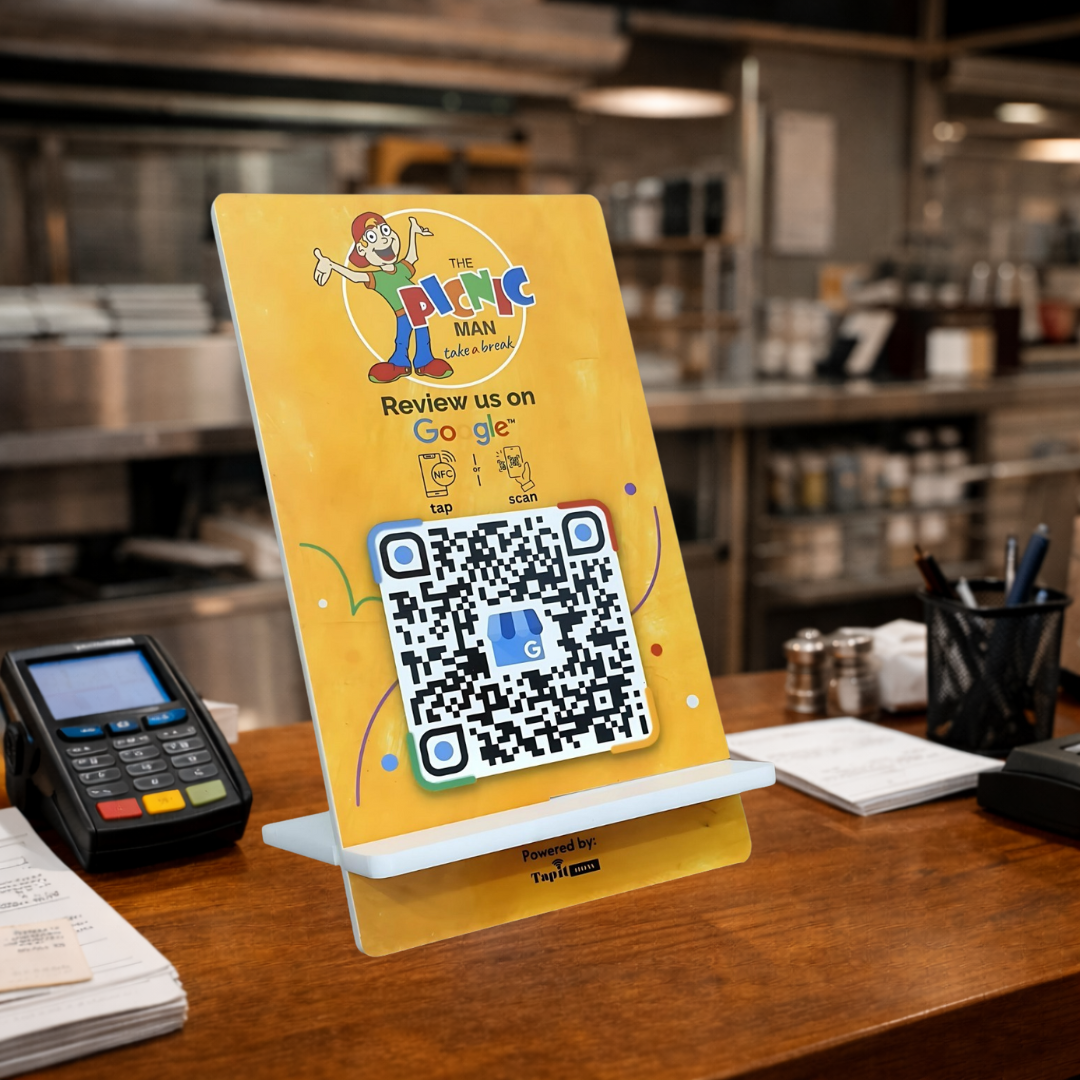 With a single tap or scan, customers can leave Google reviews.